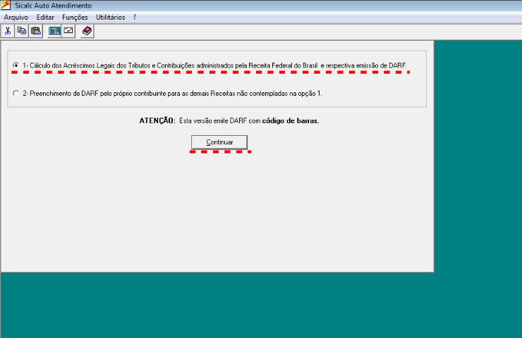3- Escolha a opção 1- Cálculo dos Acréscimos Legais dos Tributos e Contribuições