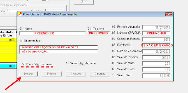 4- Na tela que abrir, insira a data de pagamento, o código da DARF, mês de